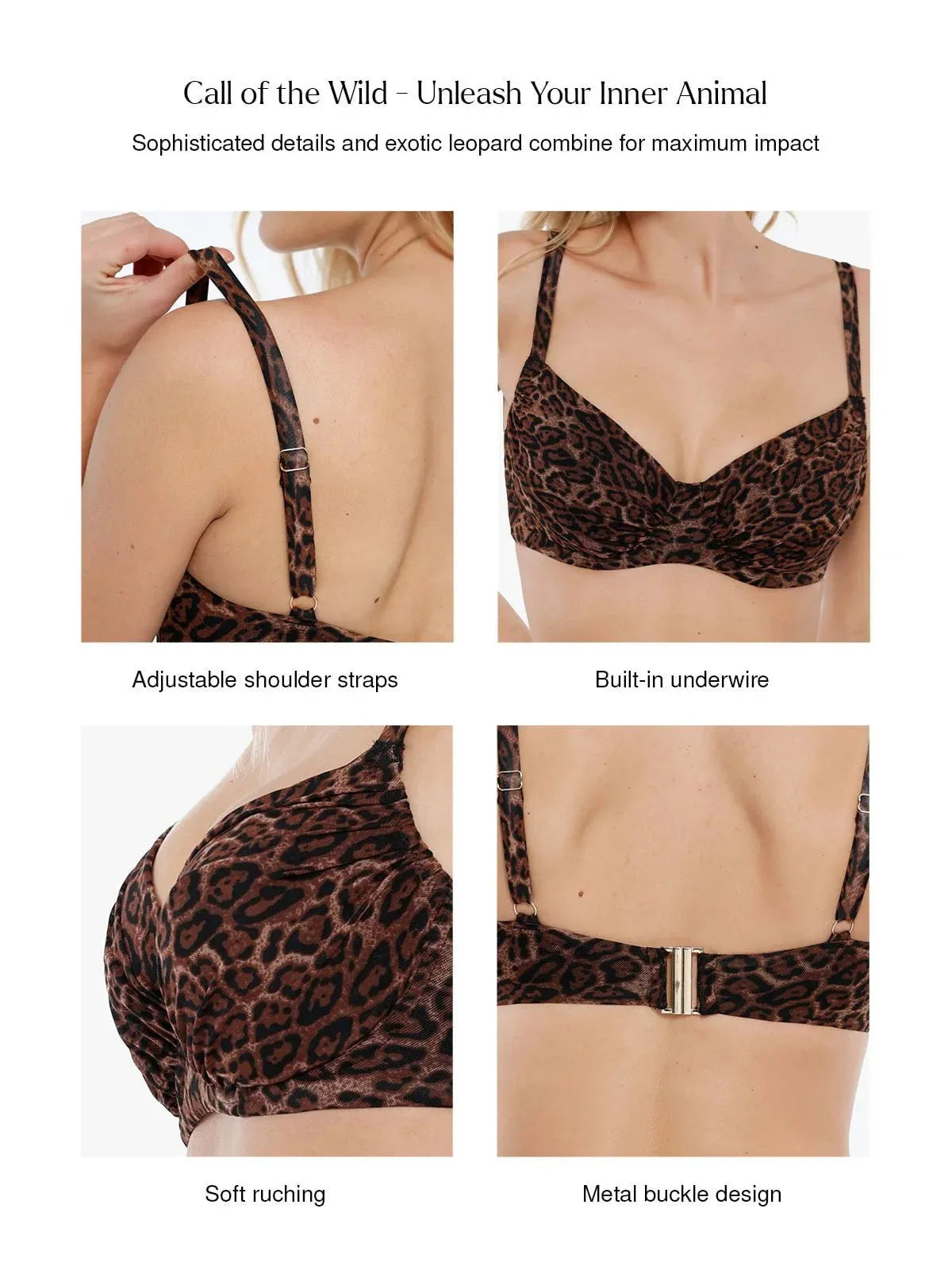 • Chest Pleat Design & Metal Buckle: Wild elegance inspired by the vibrant energy of the tropical rainforest.